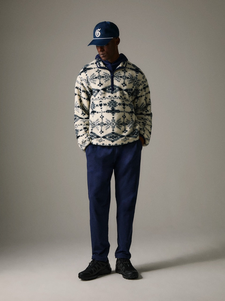 Products Displayed are the Traverse Waffle Hoodie in Maltese Blue, the Grand Teton Sherpa Half-Zip Jacket in Frost, and the Rhinebeck Sport Pant in Maltese Blue.